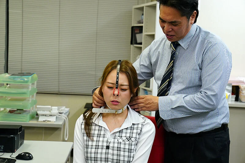 オフィスで鼻フックをするチャプターでは、OLに扮したれなさんに鼻フックをさせた後、顔面コピーを取らせています。